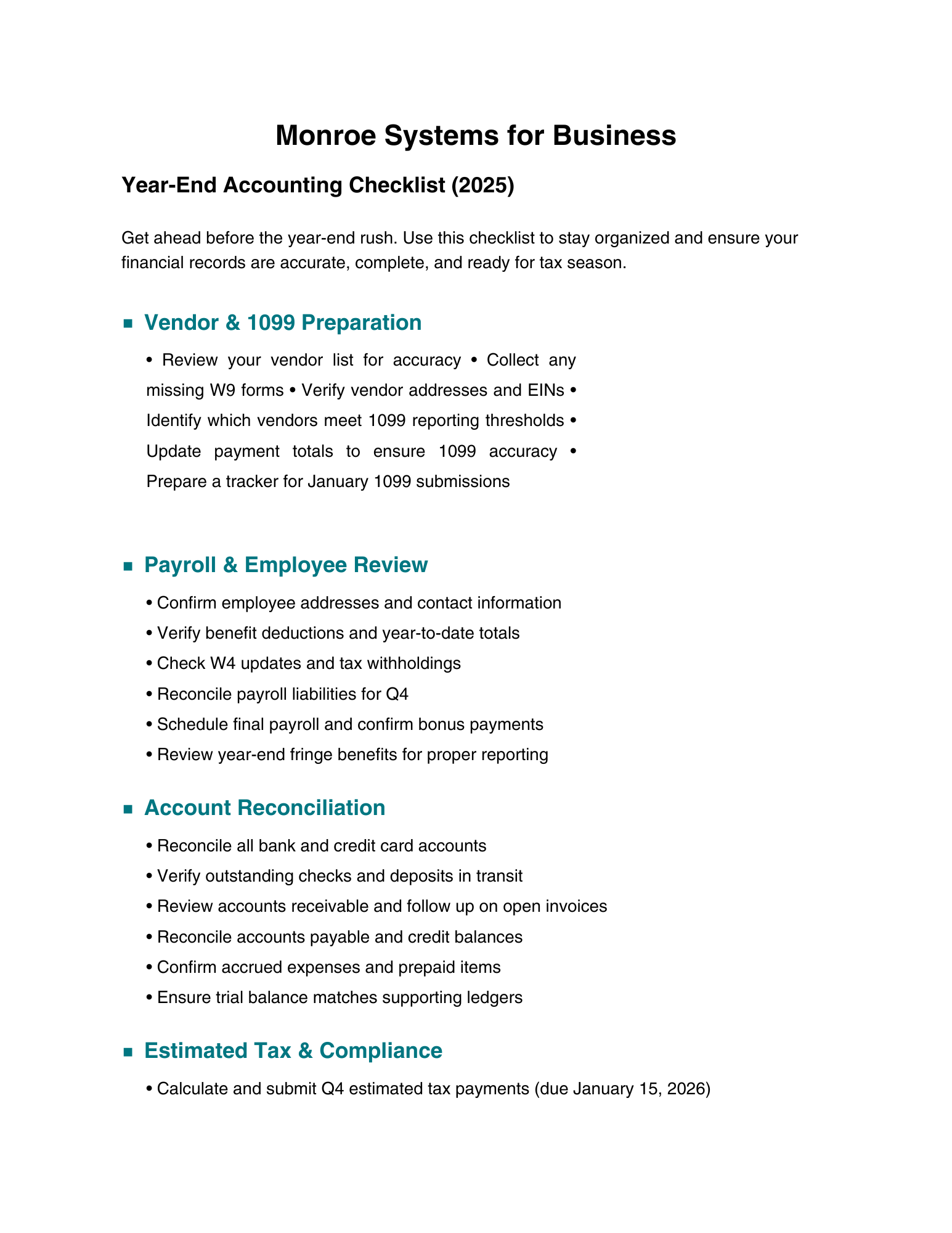 Year-End is coming up fast, so staying on task is becoming more important than ever. We have put together a little year-end checklist to make sure you're crossing off all of the necessary year-end tasks. Feel free to download your copy of the Year-End Accounting Checklist below!